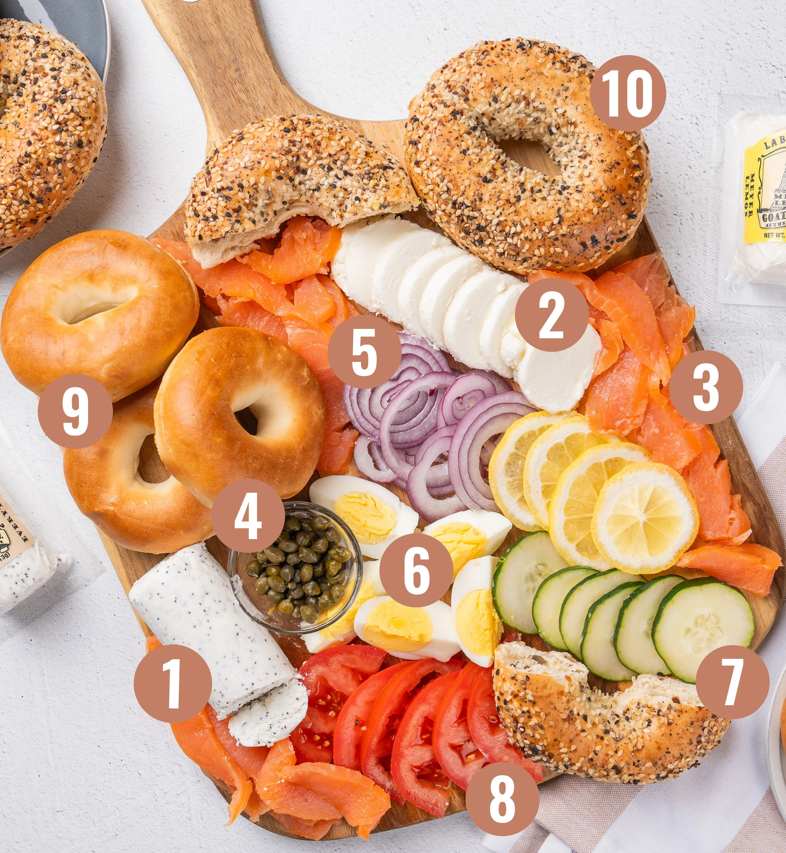 Add the mini plain bagels and everything bagels to opposite corners to anchor your board visually and provide balance.