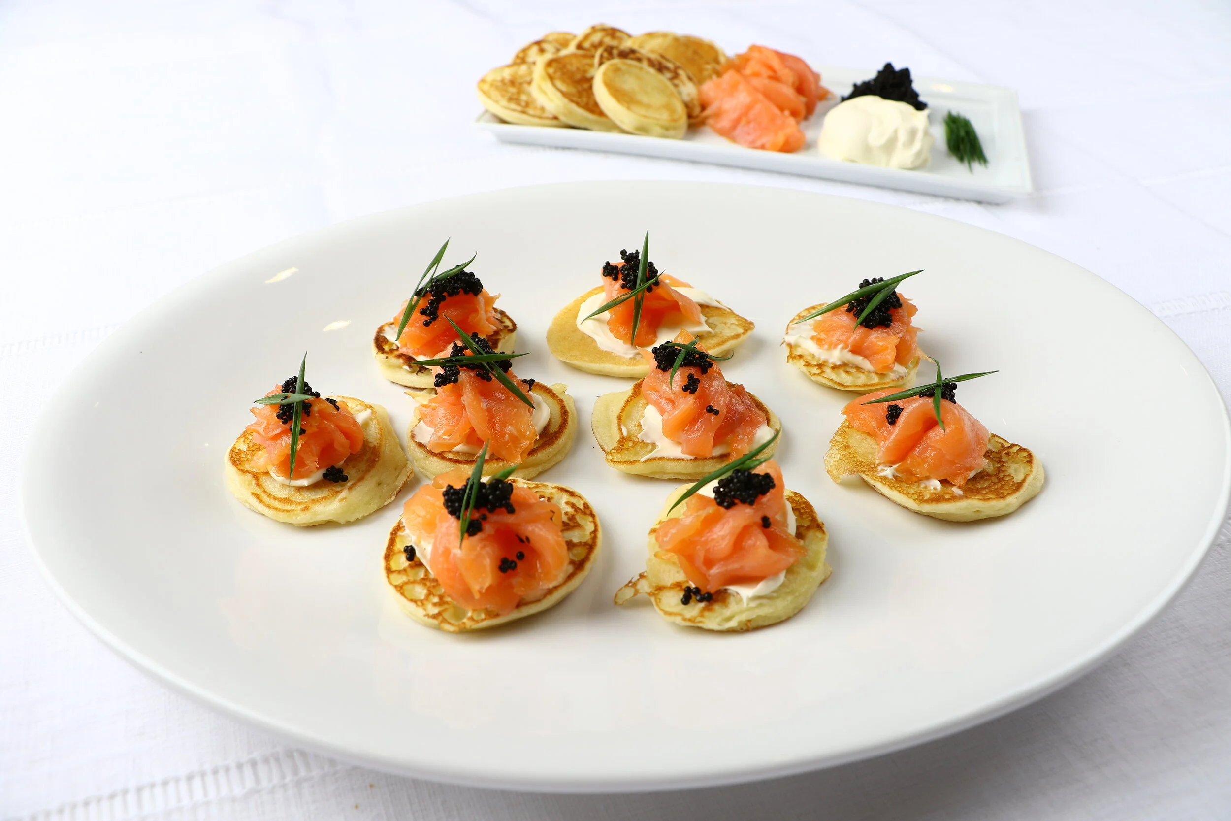 A perfect pairing of salmon, caviar, and crème fraîche on airy mini pancakes