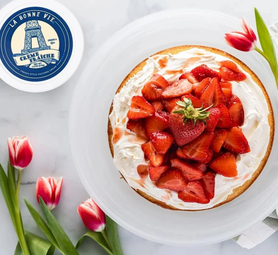 In a separate bowl, combine the heavy cream, La Bonne Vie Crème Fraîche, and salt. Whisk vigorously or beat with a hand mixer on medium-high speed until thick and light. Chill the whipped cream while you prepare the rest. Thinly slice the remaining strawberries lengthwise.
